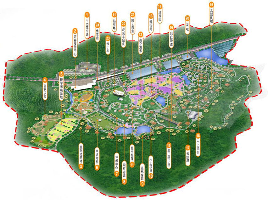2.本分为游客服务区、一期停车场、休闲游乐区、研学科普区、花海观光区、野奢民宿区、运动探险区、二期停车场、山体灯光秀等9个区。
